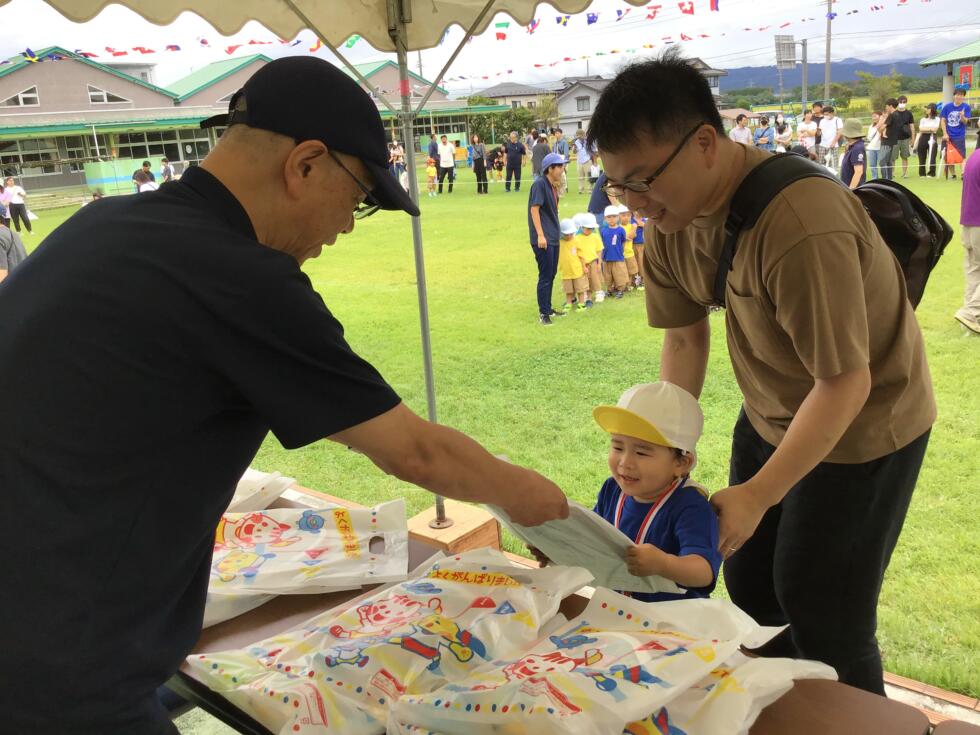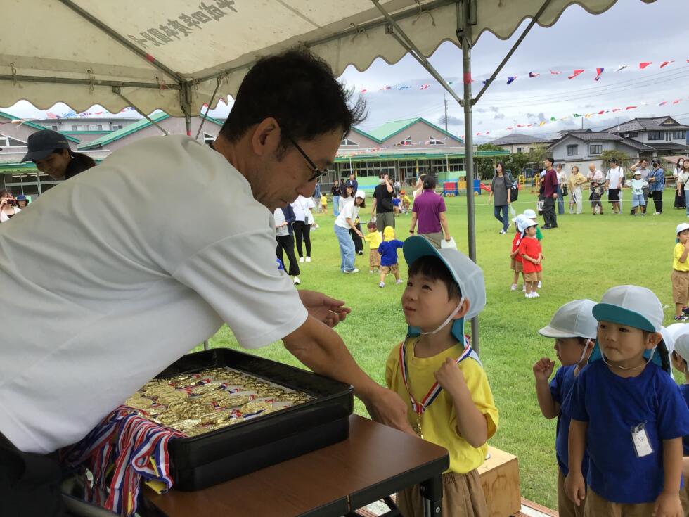 第1部すべての競技が終わり、PTA会長さんからメダルを、園長先生から賞品を受け取りました。