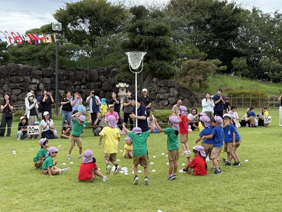 赤組も白組もカゴを目掛けて、何度も玉を投げます。