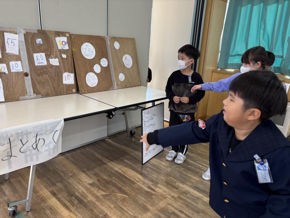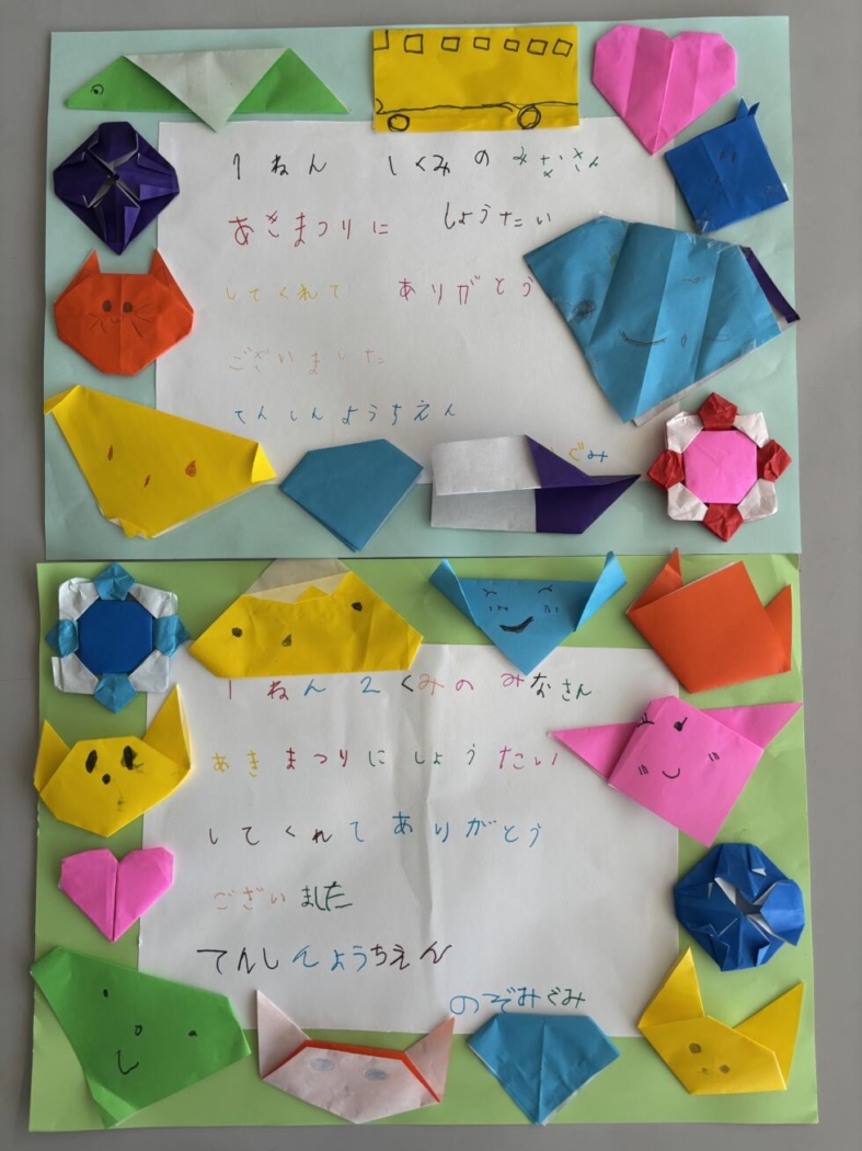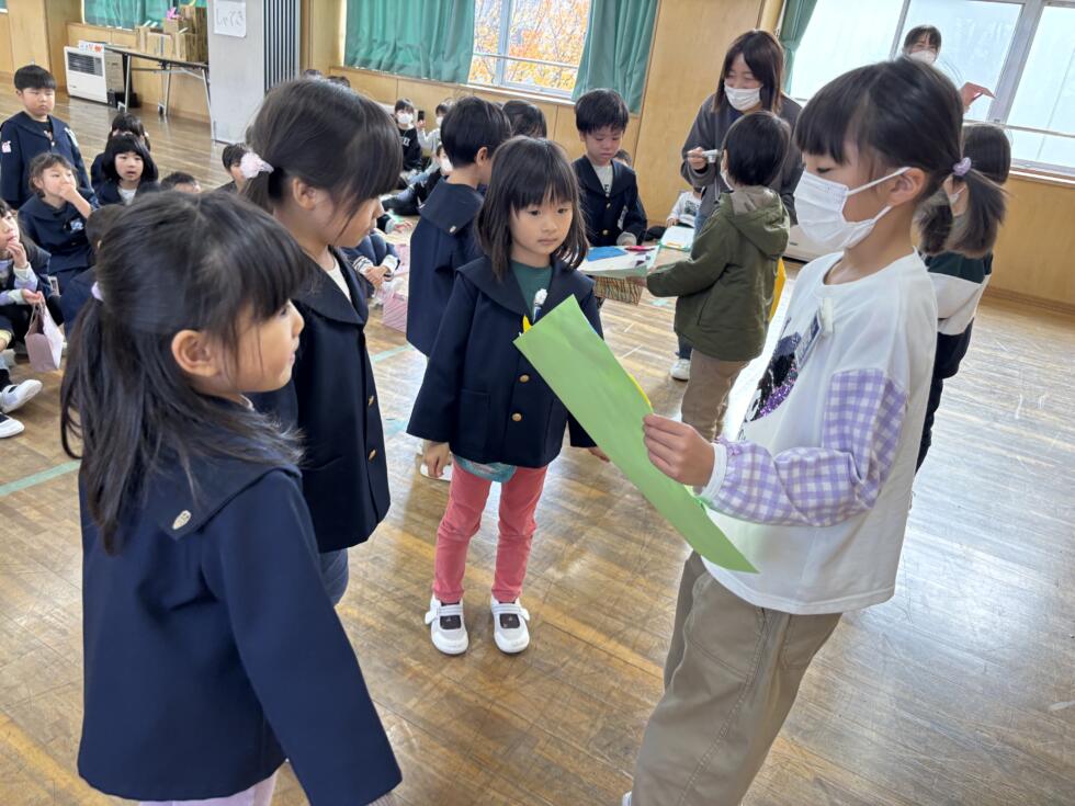 最後に、ふじみっこまつりに参加しての感想を年長組の子ども達から伝え、1年生の皆さんへ『ありがとう』の気持ちを込めて、プレゼントを渡しました。