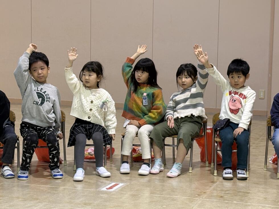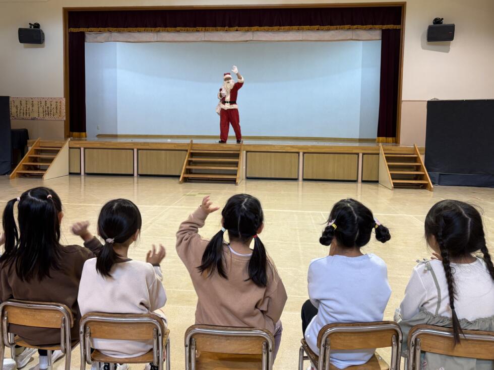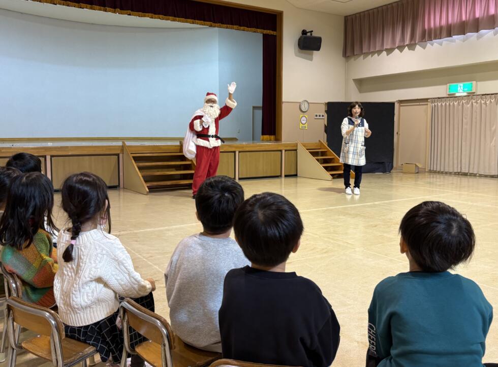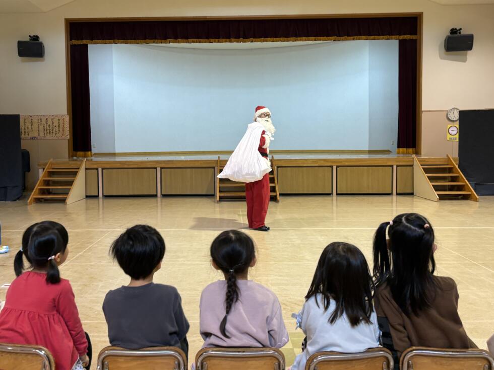 年長組は、ホールでクリスマス会をしていました。鈴の音が聞こえ、ステージの緞帳が上がると、サンタさんが立っていました!みんなすごい歓声でした✩