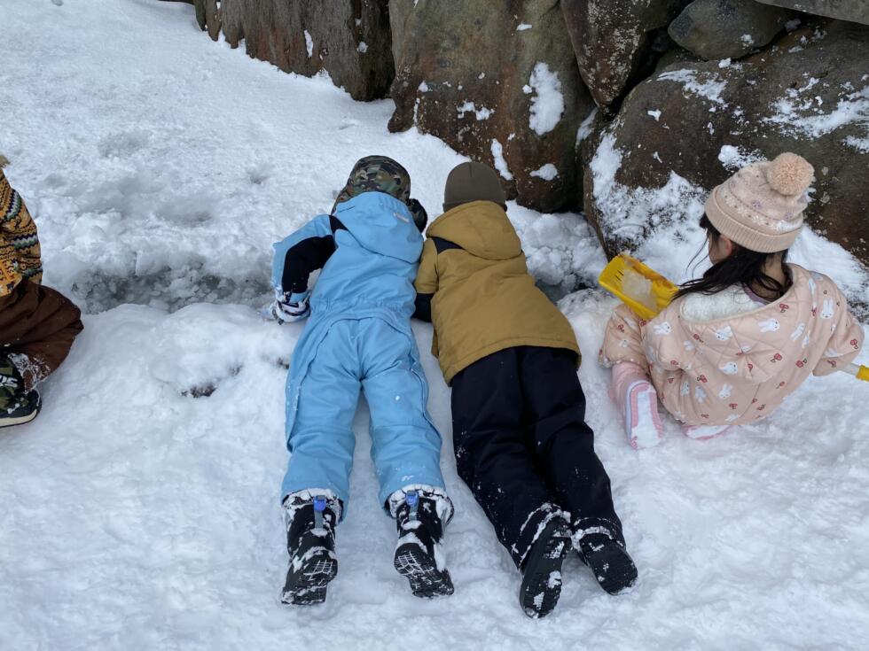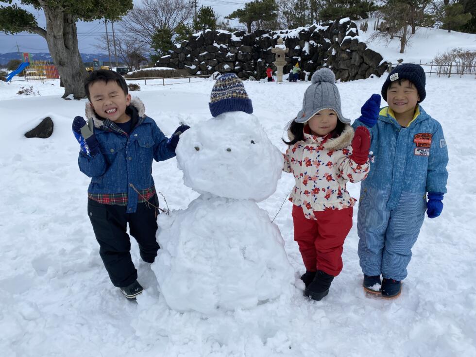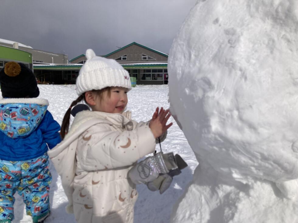 自分よりも大きな雪だるまに、小さい組のみんなは興味津々です☺