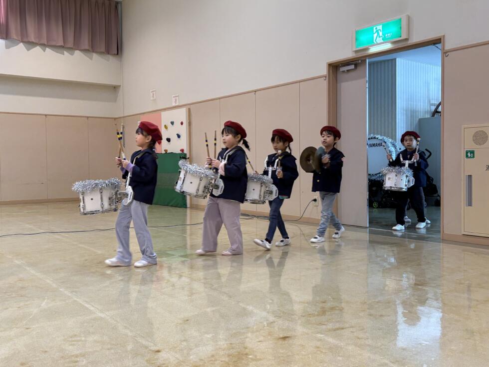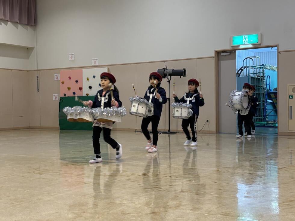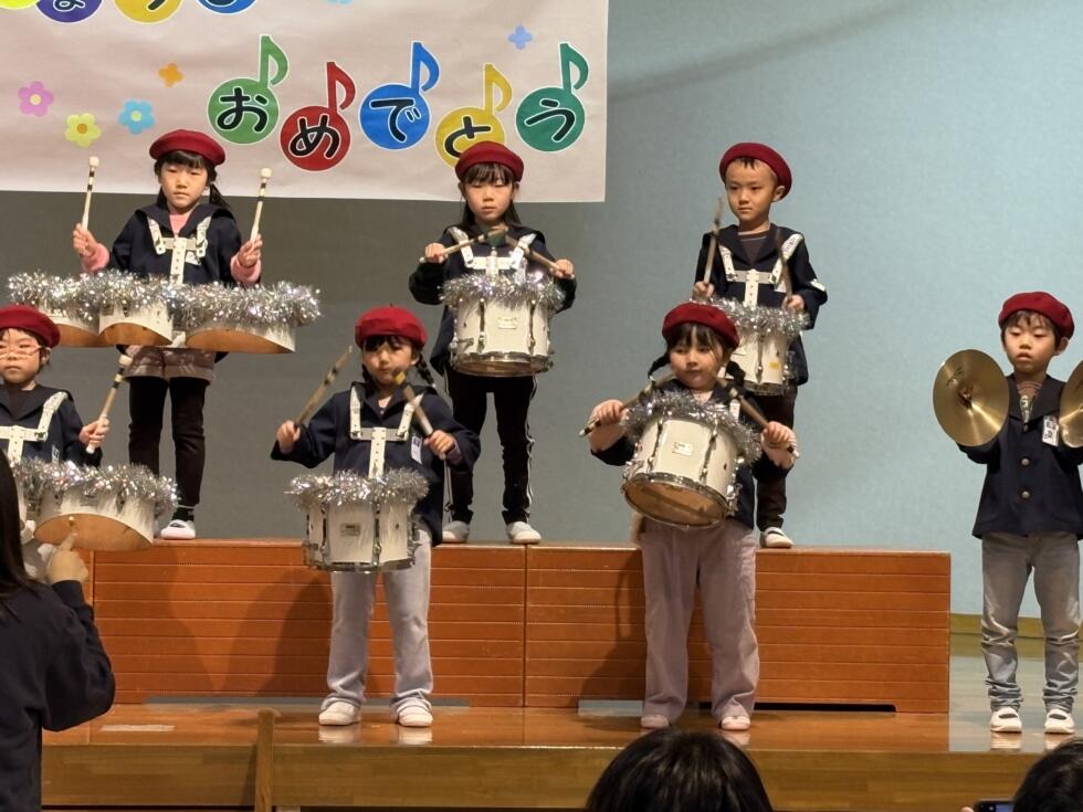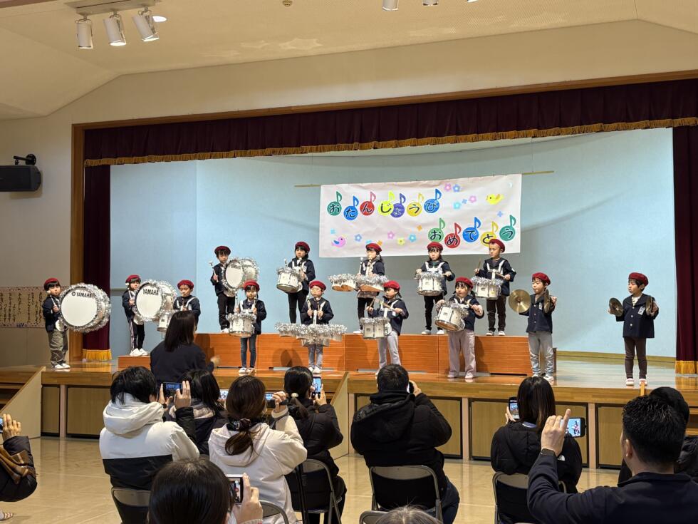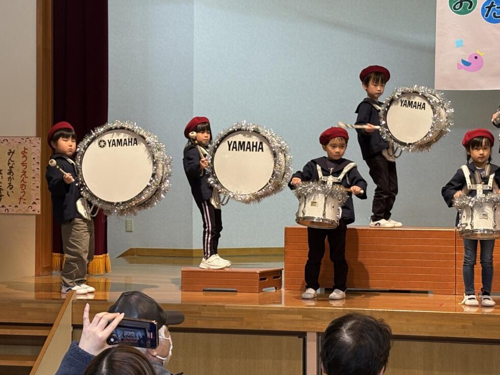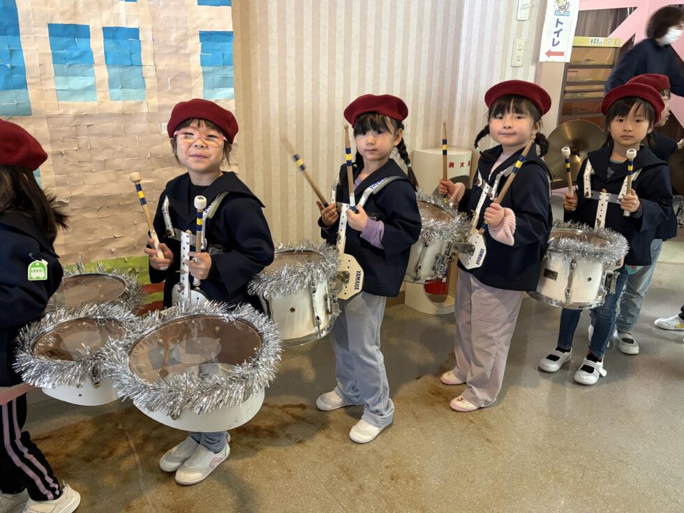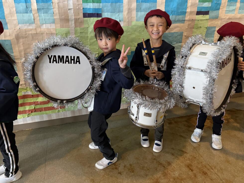 そして、この日は年長のぞみ組の鼓隊発表の日でもありました。のぞみ組のみんなには、幼稚園のみんなに向けての発表と、お家の皆さんに向けての発表と2回演奏してもらいました。