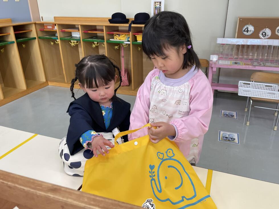 登園すると、エントランスホールで年長組のお兄ちゃんお姉ちゃんが先生達と一緒に出迎えてくれます。